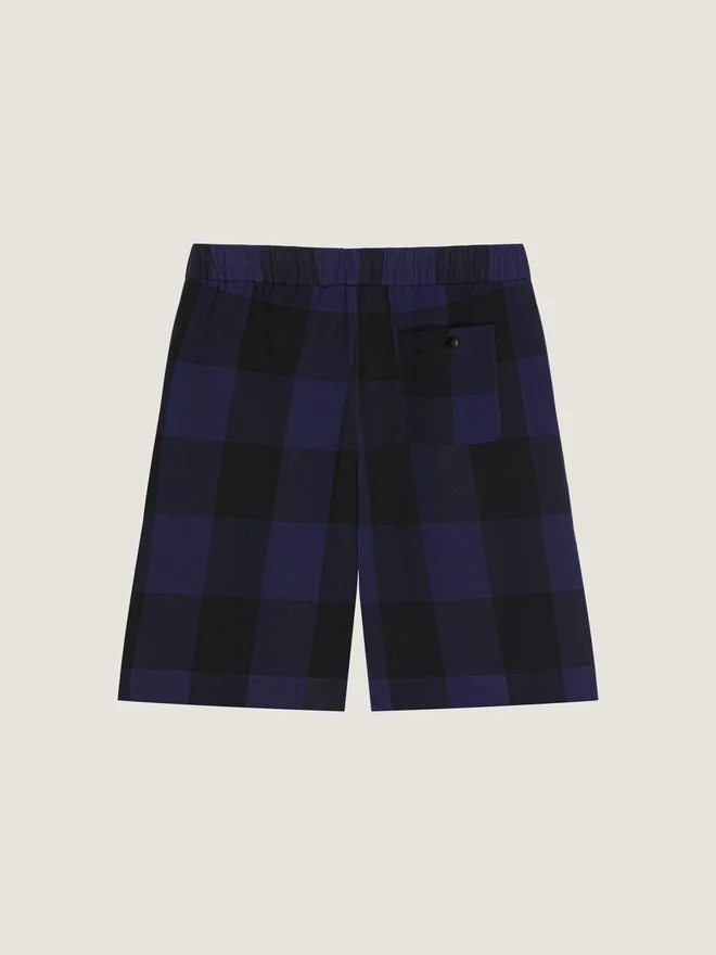 Bermude din lână cu jacquard în carouri. Talie elastică. Două buzunare laterale. Un buzunar spate. Modelul are 1,85 m înălțime și poartă mărimea 48.