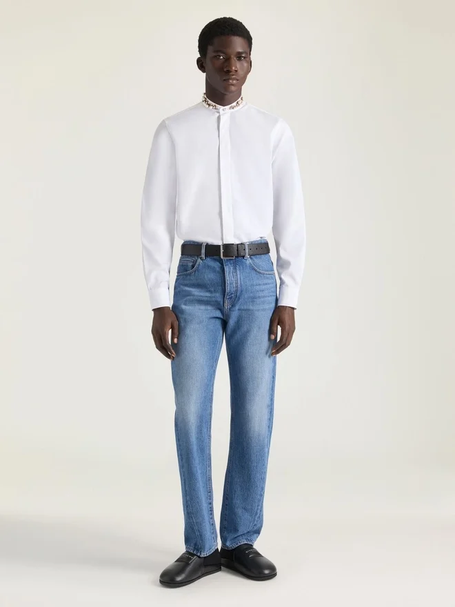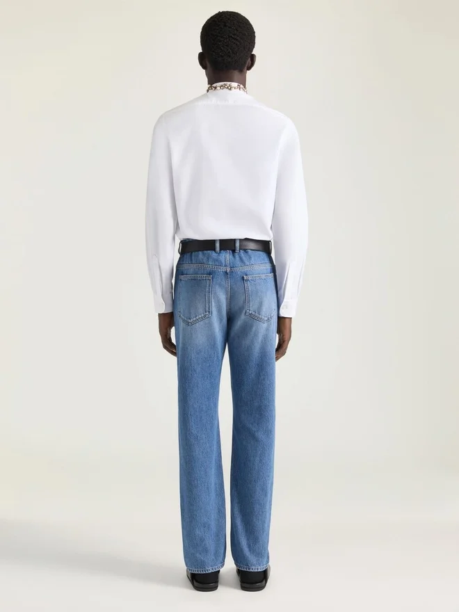 Reecoul moștenirii couture a casei Givenchy, cusăturile curbate și inversate conturează mânecile și picioarele pantalonilor pentru a crea o siluetă sculpturală. Blugi spălați în nuanțe de umbră.Talie cu bucle, închidere cu fermoar și nasturi.• Givenchy gravat. • Patch din piele Givenchy pe spate. • Trei buzunare frontale. • Două buzunare spate. • Cusături de couture. • Croială dreaptă. • Modelul are 1,85 m înălțime și poartă mărimea 30.CuloareAlbastru mediuCompoziție100% bumbac.Îngrijire- Spălare la maximum 30 °C, ciclu delicat- Calcați la temperatura maximă a tălpii (110 °C) Fără aburNu uscați în uscătorNu înălbițiNu curățați chimicȚara de origineItaliaCod produsBm51P95Yd3-420 Informații privind îngrijirea Atelierele noastre creează cu îndrăzneală și creativitate articole vestimentare unice, realizate din materiale de înaltă calitate. Pentru a păstra strălucirea produsului dvs. Givenchy, vă recomandăm să îl păstrați într-o husă de bumbac și într-un loc uscat și răcoros. Curățarea chimică este recomandată pentru majoritatea produselor noastre. Vă rugăm să urmați instrucțiunile de îngrijire de pe eticheta articolului dvs. Nu ezitați să vizitați pagina noastră dedicată sau să contactați direct echipele noastre Givenchy dacă doriți informații suplimentare.Spălare la maximum 30 °C, ciclu delicatCălcați la temperatura maximă a tălpii (110 °C) fără aburNu uscați în uscătorNu înălbițiNu curățați chimic