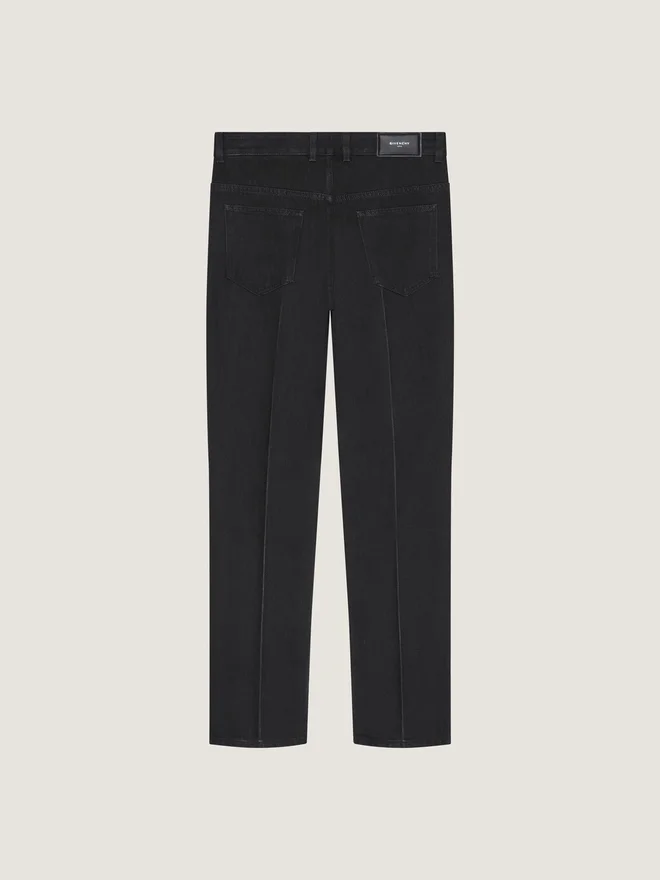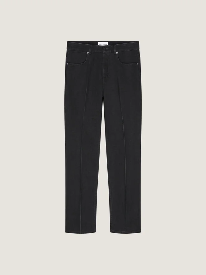 Blugi. Talia cu bucle, închidere cu fermoar și nasture. Nasture gravat Givenchy. Patch din piele Givenchy pe spate. Efect de cută