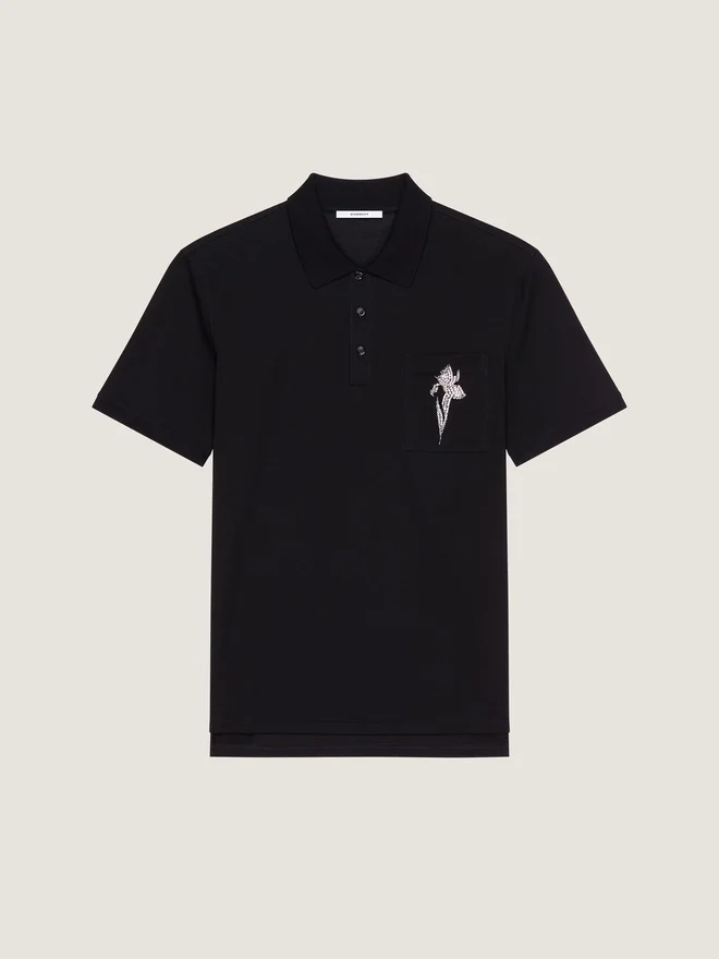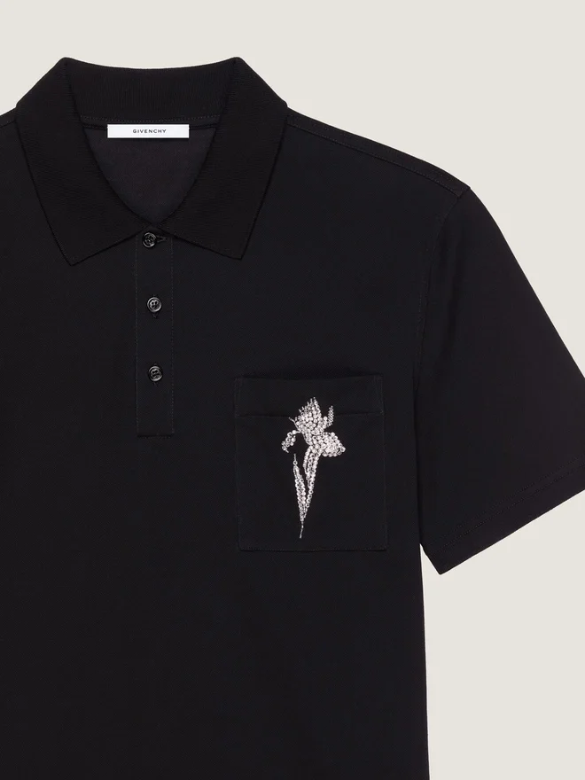 Tricou polo cu mâneci scurte din bumbac. Guler polo cu nasturi. Cristal floral brodat manual pe piept. Grosgrain cu