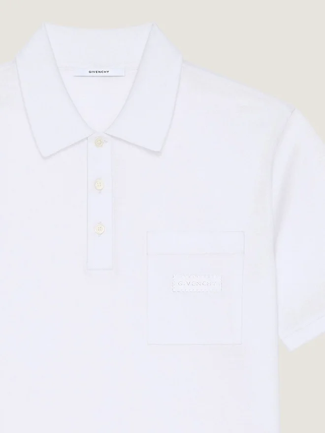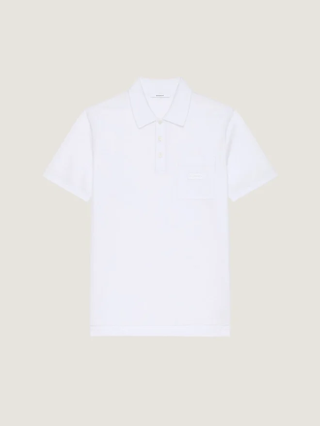 Eticheta Givenchy devine o formă subtilă de ornament, gravată, cusută sau brodată pe articole de îmbrăcăminte. Tricou polo cu mâneci scurte