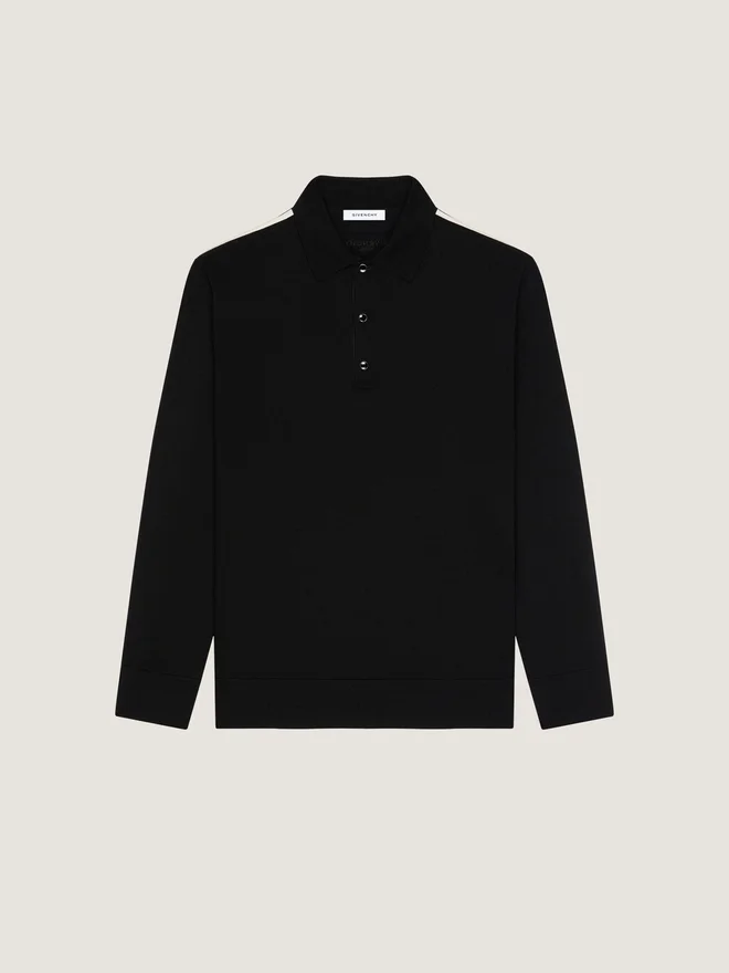Eticheta Givenchy devine o formă subtilă de ornament, gravată, cusută sau brodată pe articole. Tricou polo cu mâneci lungi