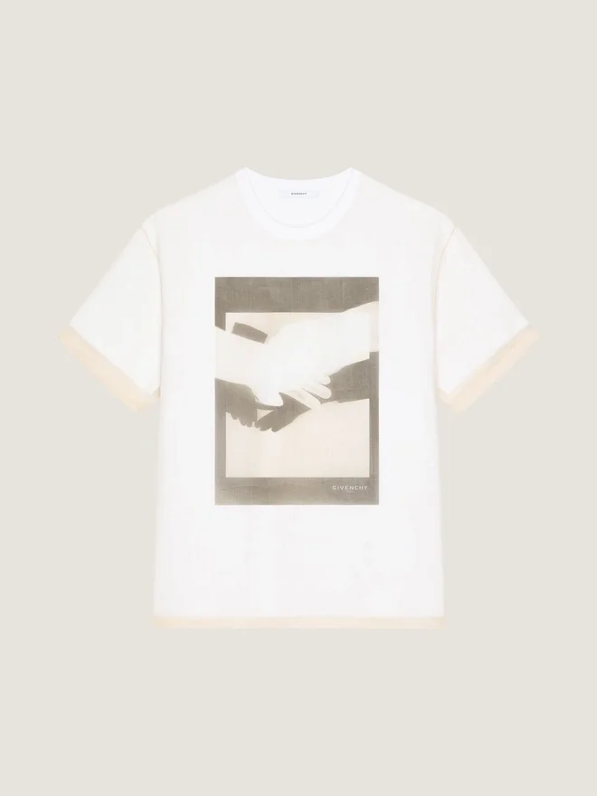 Imprimeurile suprarealiste cu mănuși și accesorii din colecția Givenchy iarna 2025 reflectă referințele culturale și obiectele care stau la baza creațiilor lui Sarah Burton. Tricou cu mâneci scurte suprapuse din bumbac și organza.Guler rotund. Imprimeu suprarealist cu mănuși pe partea din față. Signature Print mică Givenchy Paris imprimată pe partea din față. Culoare Bej Compoziție 100% bumbac. Material secundar: 100% mătase.ÎngrijireSpălare manuală, temperatură maximă (40 °C)Călcare la temperatura maximă a tălpii fierului de călcat (110 °C) Fără aburUscare la platNu înălbițiNu curățați chimicȚara de originePortugaliaCod produsBm71Nk1Yk0-250 Informații privind îngrijirea: atelierele noastre creează cu îndrăzneală și creativitate articole vestimentare unice, realizate din materiale de înaltă calitate. Pentru a păstra strălucirea produsului dvs. Givenchy, vă recomandăm să îl păstrați într-o husă de bumbac și într-un loc uscat și răcoros. Curățarea chimică este recomandată pentru majoritatea produselor noastre. Vă rugăm să urmați instrucțiunile de îngrijire de pe eticheta articolului dvs. Nu ezitați să vizitați pagina noastră dedicată sau să contactați direct echipele noastre Givenchy dacă doriți informații suplimentare.Spălare manuală, temperatură maximă (40 °C)Călcați la temperatura maximă a tălpii (110 °C) fără aburUscare pe suprafață planăNu înălbițiNu curățați chimic