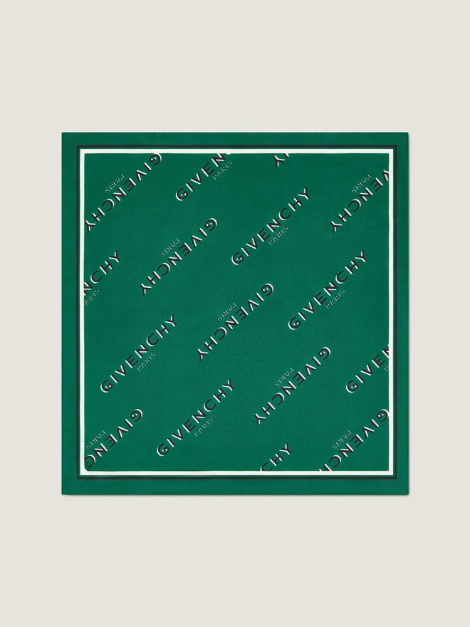 Eșarfă pătrată mică din mătase twill. Imprimeu Givenchy Paris Signature Print pe toată suprafața. Margini rulate manual.