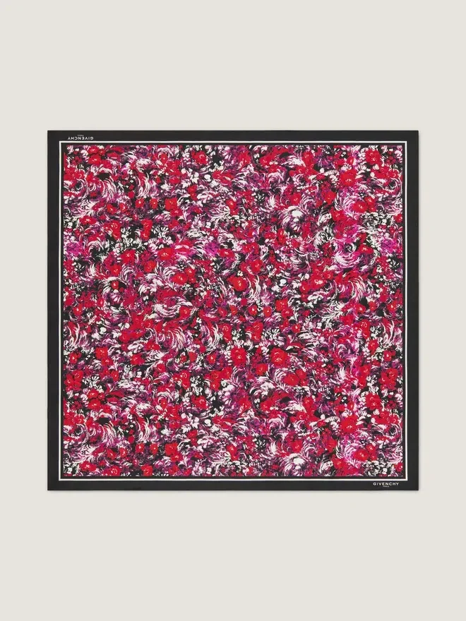 Pătrat din mătase twill. Imprimeu floral. Margini rulate manual cu semnătura Givenchy Paris în contrast.