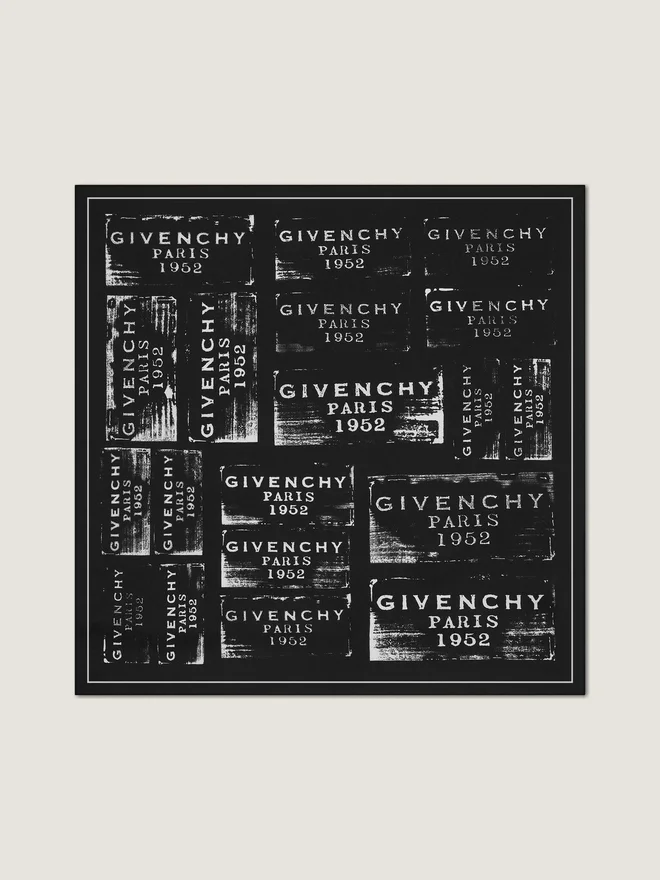 Șal din sârgă de mătase. Imprimeu patchwork cu sigla Givenchy. Margini rulate manual.