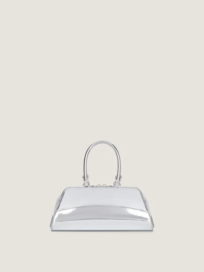 Geantă de mână mică sau geantă crossbody din piele de vițel laminată cu efect oglindă și piele granată lucioasă. Linia Antigona. Formă lungă est-vest cu