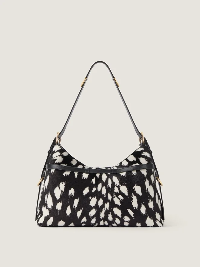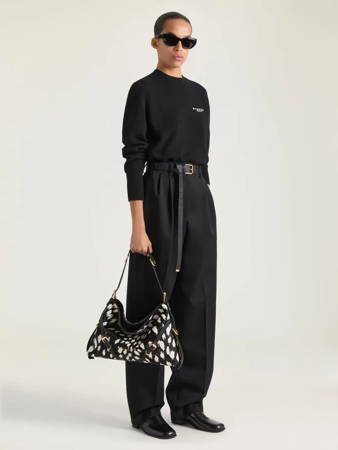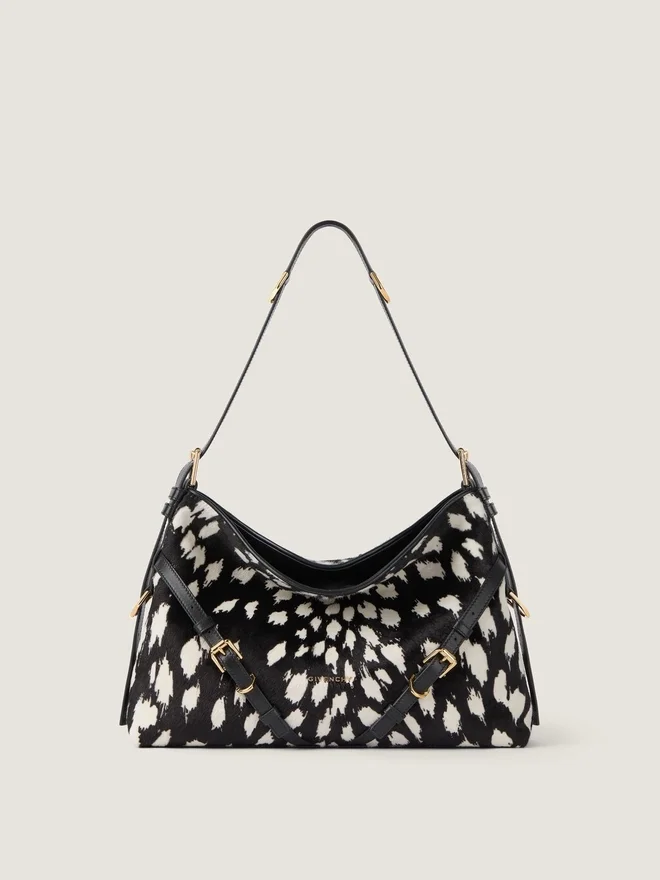 • Geantă de umăr de dimensiuni medii din piele de vițel cu aspect de piele de ponei și model leopard de zăpadă.• Linia Voyou.• Siluetă lejeră în formă de V și volum generos.• Curea de umăr reglabilă, care permite purtarea în mână, pe umăr sau în bandulieră.Semnătura Givenchy din metal pe partea din față a genții și în relief pe partea superioară a curelei. Etichetă Givenchy Paris în interior. Catarame metalice gravate cu sigla Givenchy. Detalii metalice cu finisaj auriu.• Un compartiment principal și un buzunar cu fermoar în interior. • Căptușeală din piele de căprioară. • Fiecare geantă este unică, iar imprimeul poate diferi de la un model la altul. DimensiuniD 15 in x 12,2 in x 3,9 inD Lungime cureaD Min: 9,8 in • Max: 21,7 in 18 cm x 13,5 cm x 3,5 cm Portcard Da Etui pentru ochelari – Umbrelă de buzunar – iPhone 13 Da Carte de buzunar – iPad Pro – MacBook Air -Ce încape în Voyou Bag? Dimensiuni: 29,5 cm x 11 cm x 16,5 cm