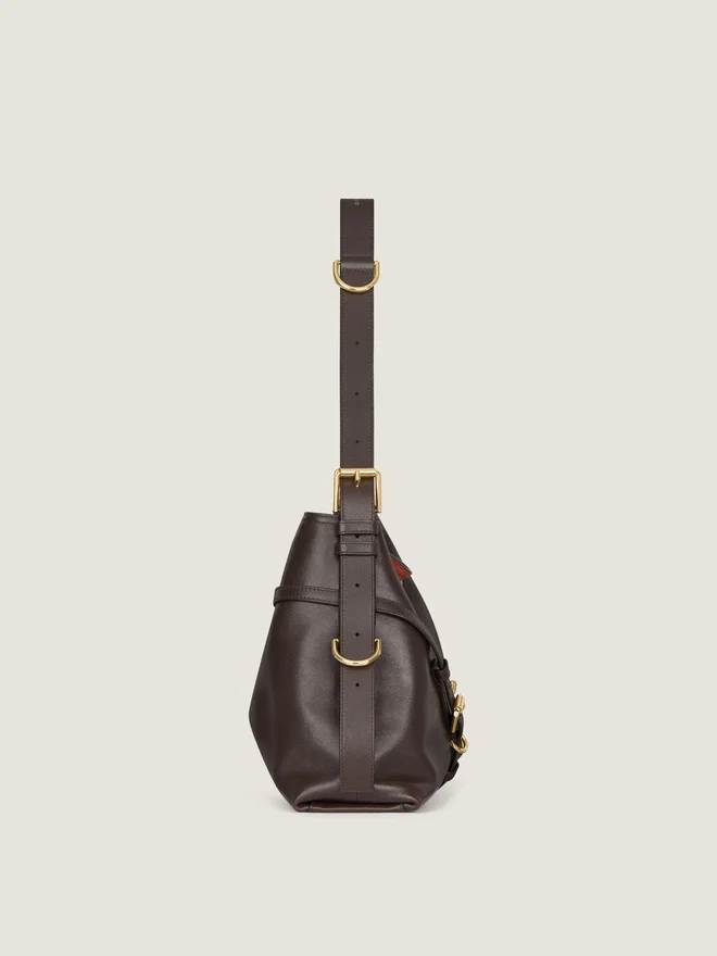 Voyou Shoulder Bag medie din piele de vițel netedă și lucioasă de calitate superioară. Linia Voyou. Siluetă lejeră în formă de V și volum generos.