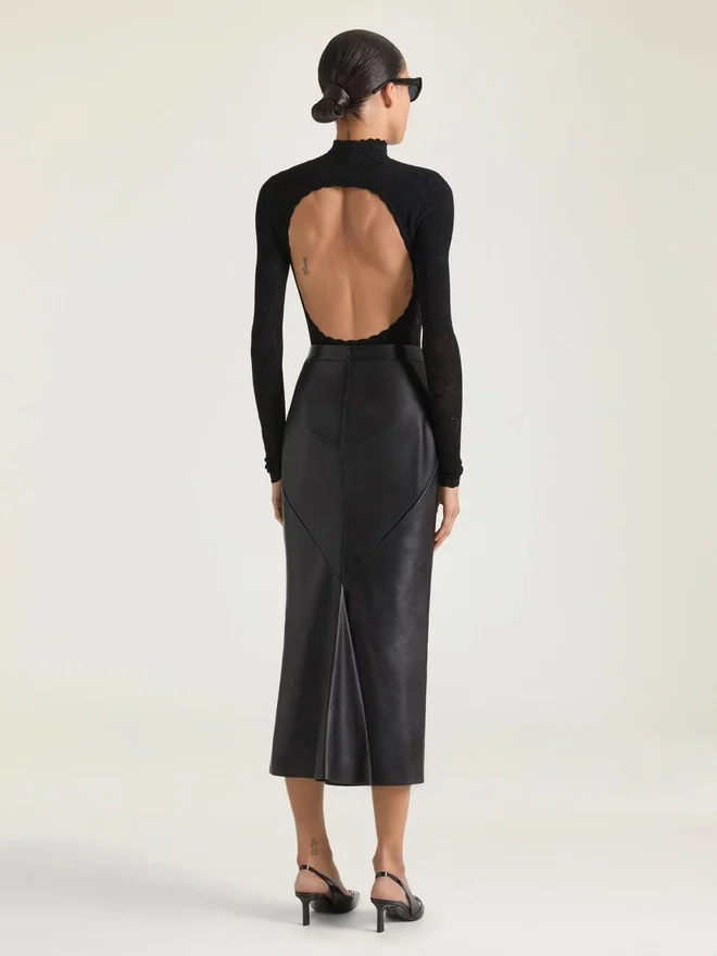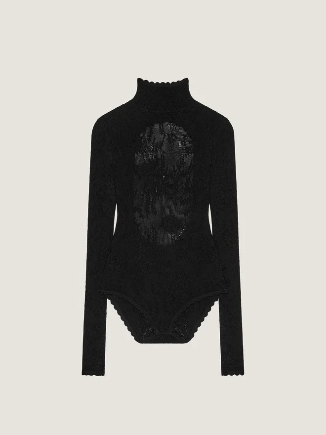 Body cu mâneci lungi din dantelă florală tricotată. Guler înalt. Spate decupat. Închidere cu cârlige în zona inghinală. Modelul are 1,77 m înălțime și poartă mărimea S.