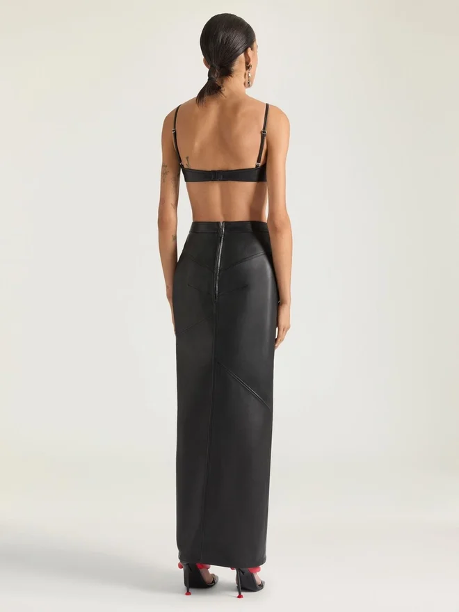 Feminitatea și eleganța sunt exprimate prin broderii din piele și perle, cu sutiene purtate sub jachete și detalii decupate care apar în croiala costumelor, rochiilor și articolelor tricotate. Sutienele decupate sunt integrate în articole vestimentare pentru a dezvălui corpul, explorând interacțiunea dintre îmbrăcat și dezbrăcat. Sutien decupat din piele de miel Plonge.Bretele reglabile. Închidere cu cârlige în spate. Modelul are 1,77 m înălțime și poartă mărimea 36. CuloareNegruCompoziție100% piele de miel.ÎngrijireNu spălațiNu călcațiNu uscați în uscătorNu înălbițiNu curățați chimicȚara de origineItaliaCod produsBw61M1604J-001
