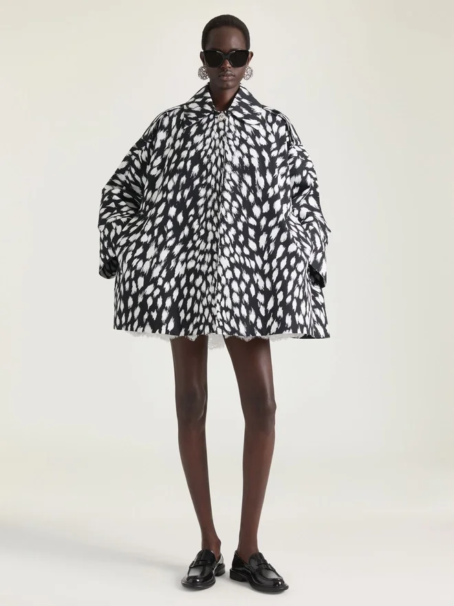 Volumul este exagerat, modelele sunt reinterpretate, iar cusăturile sunt inversate pentru a contura silueta tip cocon.Trench scurt din bumbac, cu mâneci trei sferturi.Imprimeu animalier.Guler clasic.Închidere cu nasturi.Nasturi argintii cu inscripția Givenchy.Detaliu tip capă în spate.Două buzunare laterale.Două fante mici pe laterale. Cusături de tip couture pentru un volum cocoon. Modelul are 1,77 m înălțime și poartă mărimea 36. D CuloareD NegruD CompozițieD 100% bumbac.D ÎngrijireNu spălațiNu călcațiNu uscați în uscătorNu înălbițiNu curățați chimicȚara de origineItaliaCod produsBw00Ts16Em-001- Informații privind îngrijirea: Atelierele noastre creează cu îndrăzneală și creativitate articole vestimentare unice, confecționate din materiale de înaltă calitate. Pentru a păstra strălucirea produsului dvs. Givenchy, vă recomandăm să îl păstrați într-o husă de bumbac și într-un loc uscat și răcoros. Curățarea chimică este recomandată pentru majoritatea produselor noastre. Asigurați-vă că respectați instrucțiunile de îngrijire de pe eticheta articolului.Vă invităm să vizitați pagina noastră dedicată sau să contactați direct echipele Givenchy dacă doriți informații suplimentare.- A nu se spăla- A nu se călca- A nu se usca în uscător- A nu se înălbi- A nu se curăța chimic