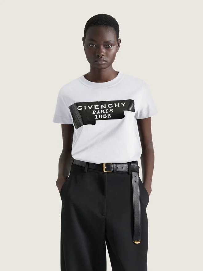 Evocând articolele de papetărie de arhivă ale atelierului Givenchy, acest imprimeu Trompe-L’œIl reproduce aspectul benzii autentice, creând un efect tridimensional complex care reflectă măiestria casei. Tricou cu mâneci scurte din bumbac.Guler rotund. Imprimeu 3D Givenchy Tape pe față. Croială ajustată. Modelul are 1,77 m înălțime și poartă mărimea XS. D CuloareD D AlbD D CompozițieD D 100% bumbac.D ÎngrijireSpălare la maximum 30 °C, ciclu delicatCălcare la temperatura maximă a tălpii (110 °C) Fără aburNu uscați în uscătorNu înălbițiNu curățați chimicȚara de originePortugaliaCod produsBw70Fjp78U-100 Informații privind îngrijirea Atelierele noastre creează cu îndrăzneală și creativitate articole vestimentare unice, realizate din materiale de înaltă calitate. Pentru a păstra strălucirea produsului dvs. Givenchy, vă recomandăm să îl păstrați într-o husă de bumbac și într-un loc uscat și răcoros. Curățarea chimică este recomandată pentru majoritatea produselor noastre. Vă rugăm să urmați instrucțiunile de îngrijire de pe eticheta articolului dvs. Nu ezitați să vizitați pagina noastră dedicată sau să contactați direct echipele noastre Givenchy dacă doriți informații suplimentare.Spălare la maximum 30 °C, ciclu delicatCălcați la temperatura maximă a tălpii (110 °C) fără aburNu uscați în uscătorNu înălbițiNu curățați chimic